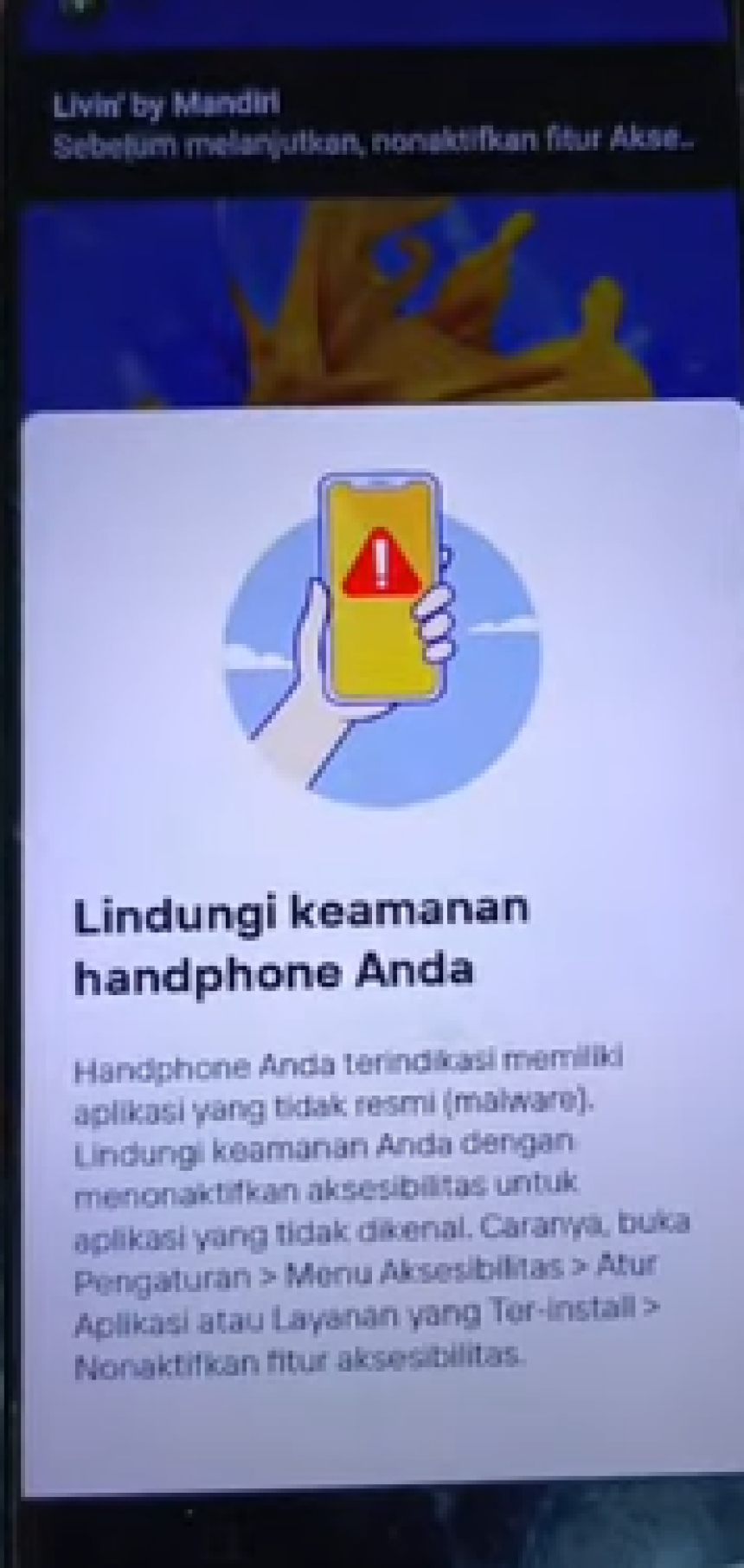 "Pastikan di HP anda tidak ada aplikasi yang tidak dikenal dan matikan fitur berbagi layar (share screen) atau kontril handphone jarak jauh dst"