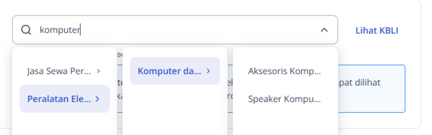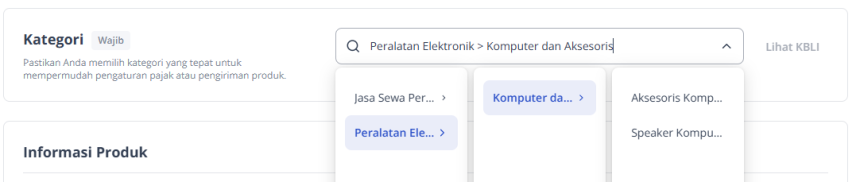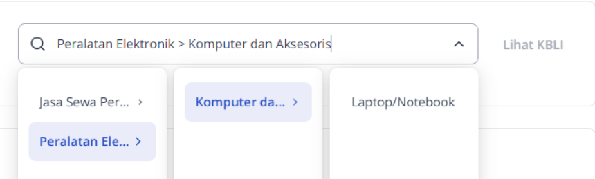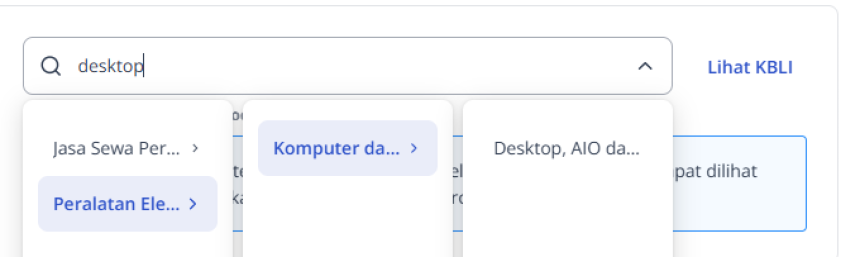 Cara praktisnya, ketikkan jenis produk di kolom Kategori, lalu biarkan sistem mencari jenis produk yang sesuai. Contoh ketikkan "laptop", atau "dekstop" untuk PC Desktop, atau jenis produk lainnya sesuai produk anda.