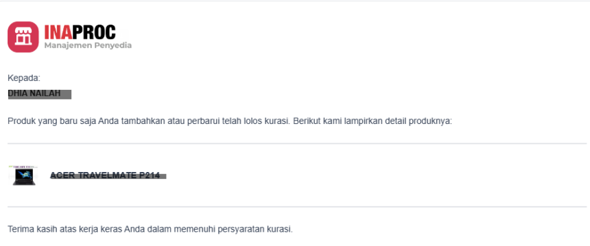 Tapi kaget juga ternyata produk saya tidak lolos kurasi, alias ditolak atau tidak dapat ditayangkan di sistem E Katalog 6 Inaproc. Adapun isi email tersebut ada menjelaskan alasan produk ditolak yaitu : Kategori produk tidak sesuai.